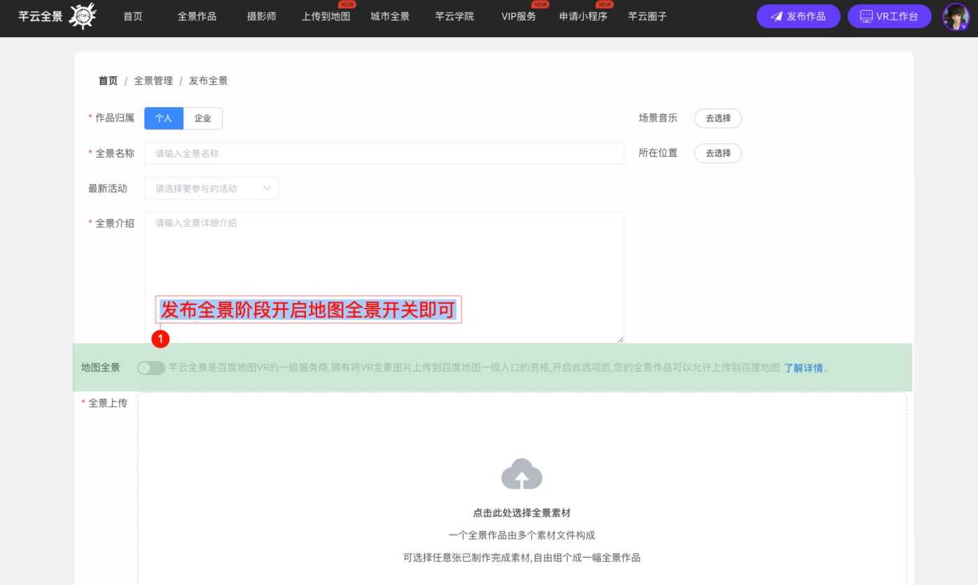 PC端上传通道: 在发布全景阶段打开地图全景开关即可。