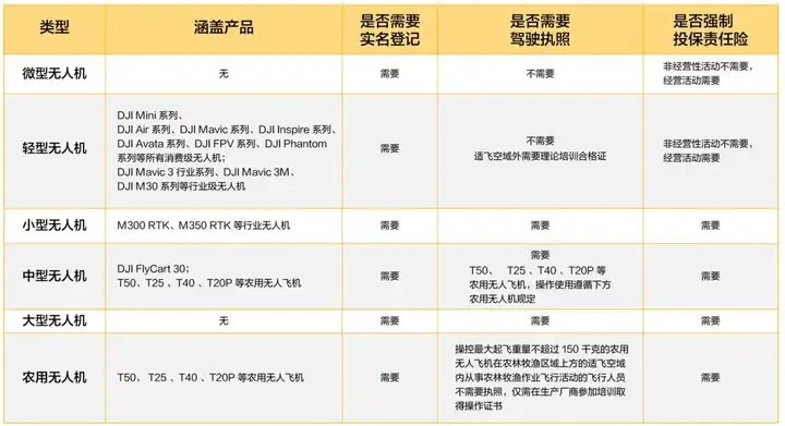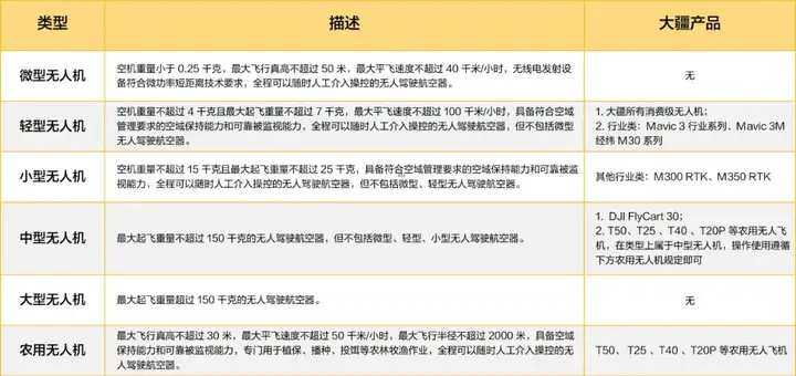 无人机个体差异非常大,新规按照分类管理的思路,根据重量、飞行速度等性能指标,将无人机分为微型、轻型、小型、中型、大型五个类别。差异化的监管要求,能更好地适应实际情况。
